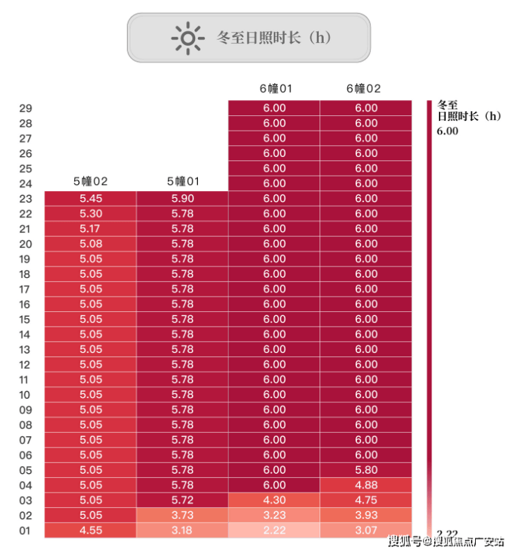 第三方平台对5#楼王做了模拟日照分析,结果相当不错。在冬至日(取值9:00-15:00)平均采光时长在5.6小时,超91%的房源采光时长超过5小时。对比同地段房源,冬至日采光一般在3小时左右。
