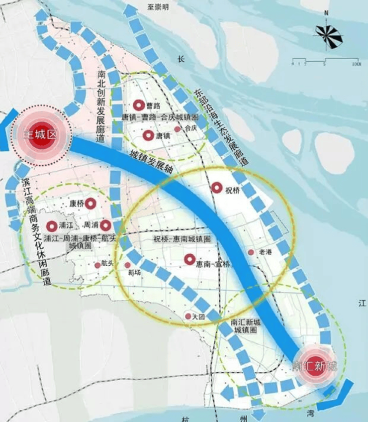 从浦东整体的区划来看,惠南正好位于浦东中心位置,在浦东的“腹地”,但浦东的重点发展在两极,一个是以陆家嘴、世博前滩为主要核心的中央活动区,另一个是南汇新城,也是自贸区临港新片区的核心。惠南虽在浦东城镇发展轴上,但却与这两极都有一定距离,对惠南的辐射效应稍显不足。