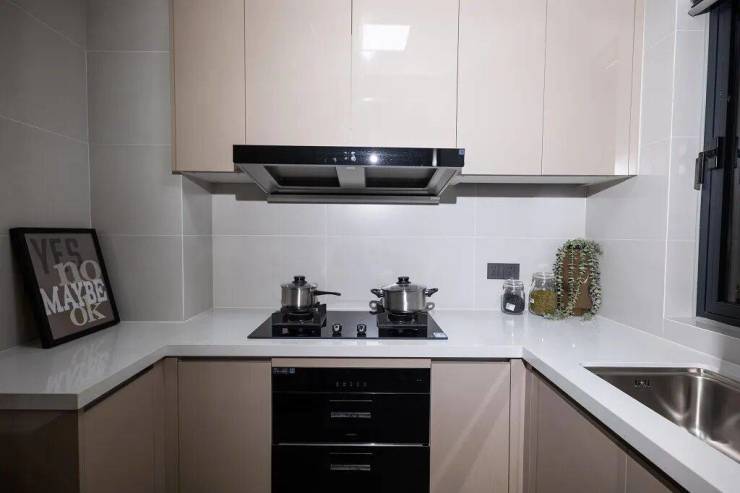 厨房部分,老板油烟机、燃气灶、消毒柜三件套成为交付标配,并为每一户预装了滨特尔前置净水器。