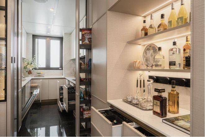室内设置大金中央空调、新风系统和地暖,搭配斯麦格冰箱,住起来特别舒服。厨房有博世四件套洗碗机、蒸烤一体机、油烟机和灶台,做饭很方便。全屋岩板铺装,既耐用又显档次。卫生间干湿分开,配了高仪卫浴、智能马桶、暖风机,主卫还有浴缸和美妆冰箱,洗澡、化妆都很享受。