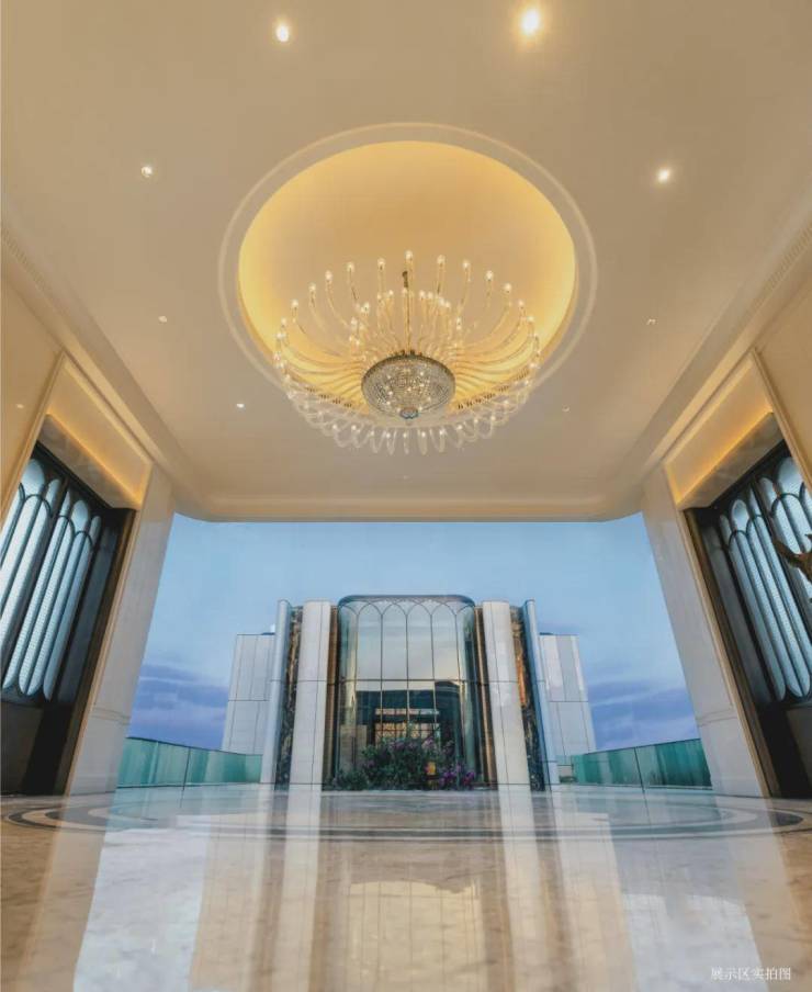 预接待厅门头源于招商局出资创办的原南洋公学(现在上海交大)三段式建筑造型。优美、经典的软装风格定制无不彰显着生活的品味,天花板定制了细腻入微的deco设计细节,地面瓷砖采用威尼斯白与爵士白石材拼花设计,纯人工铺装保证花纹的奢华质感,壁面装饰的水品灯,选用高规格的E9级进口水晶制作,真正将海派设计融入生活。