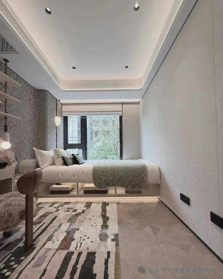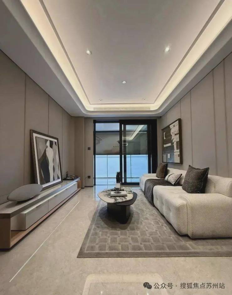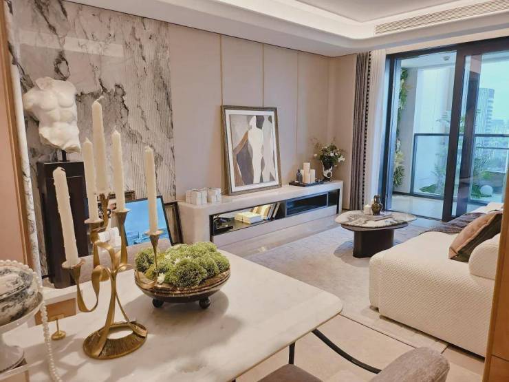 电视背景墙采用卡慕白的石材+皮革造型,弧形吊顶,相当讲究,连空调出风口的形状都打造为海上·清和玺logo山茶花的形状~~三大件为大金(或同等档次)中央空调和地暖,新风系统为百朗(或同等档次),南向阔景阳台,采光视野一级棒!