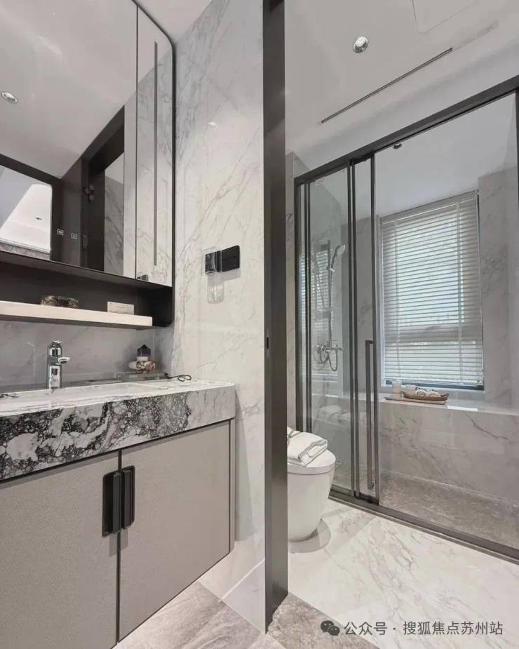 奢石台面,皮革饰面柜抽屉,侧端设置金属收纳开放格;定制镜柜,中间的透光玉石直接提升了高级感,镜柜内部配备了美妆冰箱+美妆灯条+轨道收纳!