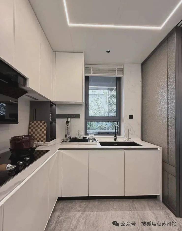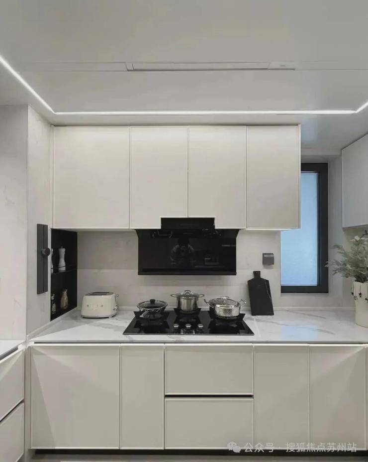 进门可以看到经典的S墙设计,L型厨房操作台面,也是暗藏不少细节——玻璃移门采用完美系列夹丝玻璃+金属造型边框,顶部配置线性凉霸+LED嵌入式回形灯带+筒灯,灶台后侧采用大面积岩板铺设,方便清洁的同时显得厨房更加大气。