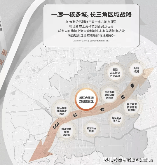 松江新城未来将会被打造成长三角综合性节点城市,将围绕长三角G60科创走廊、城乡统筹发展轴、“松江枢纽”核心功能区、“双城融合”核心功能区,形成“一廊一轴两核”的完备产业。