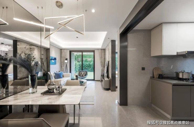 一层南向面宽约3.7米的会客厅,透过落地玻璃窗可欣赏南向花园。餐厅、厨房一体化,操作台面宽绰,动线合理,在一定程度上能够增加与家人的互