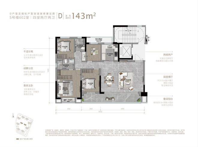 D户型|建面约143㎡四室两厅两卫