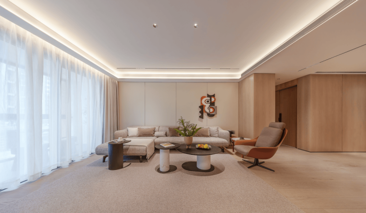 约7米面宽的客厅,结合中西厨配置的厨房,让整个LDKB一体化空间更具尺度。