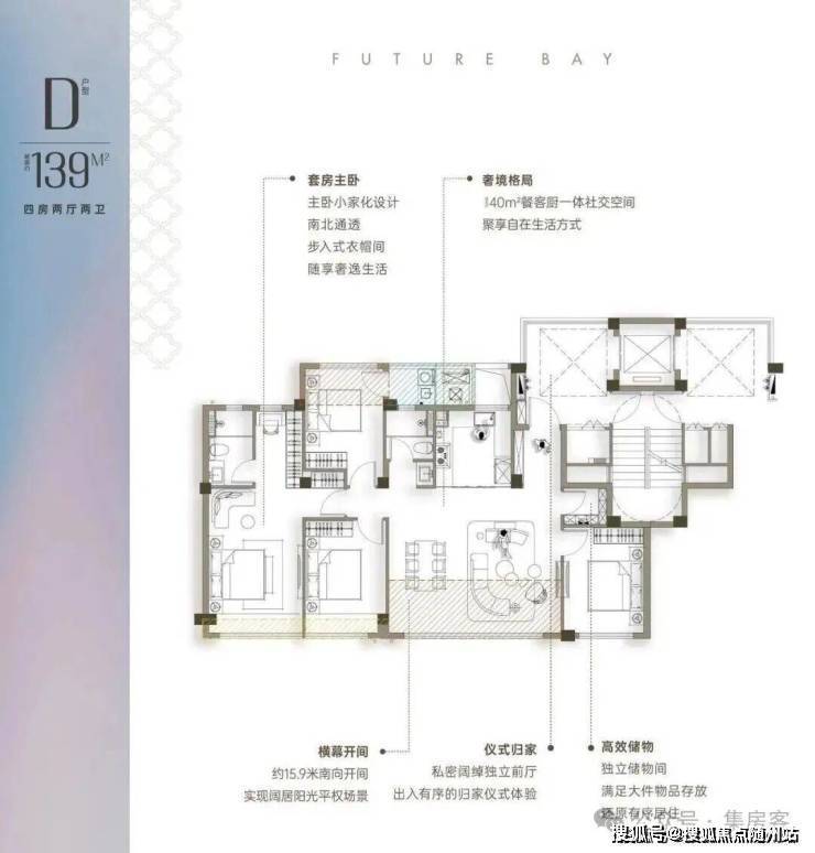 约139方户型, 4.5开间朝南+储藏间,南向15.9米超大采光面,做到五开间朝南的空间,标配储藏间,三个南向卧室设计。