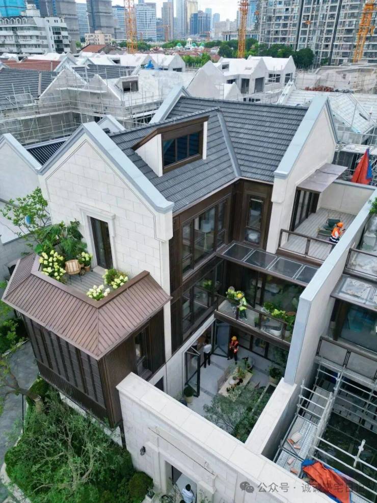 项目容积率仅1.33,绿化率高达35%,采用“新海派风格”设计,立面融合米白色真石漆、深灰色坡屋顶及红砖、青砖等传统材质,搭配进口花岗岩、三层中空Low-E玻璃与铜制线条,既保留历史韵味,又彰显现代质感。