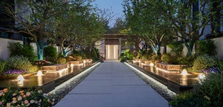 选用温润典雅的天然石材作为基底,中轴对称式布局彰显高门气魄,水景内涌泉汨汨且搭配泛星灯光,转角处的精美艺术景墙,邂逅尊崇归家仪式感。