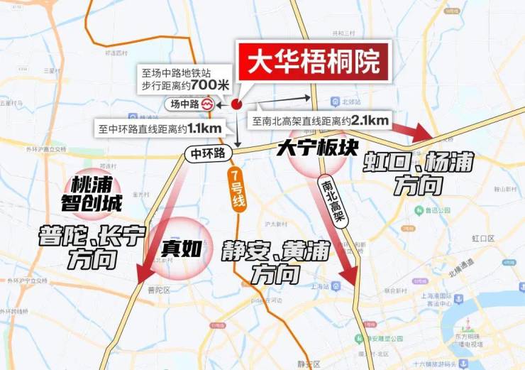 项目距离7号线场中路站直线距离约700米,可以直达真如、静安寺、徐汇滨江等商圈。