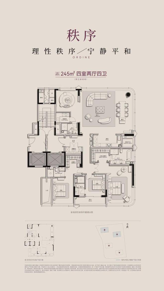 245㎡户型:四房两厅四卫,CCD郑忠设计,270°转角厅引运河入室,层高3.3米。