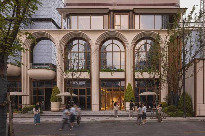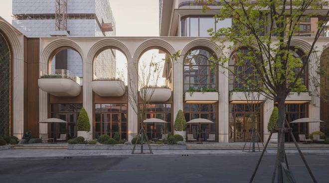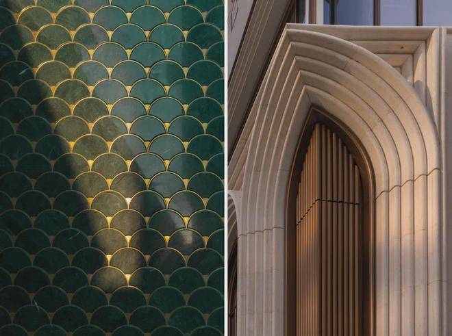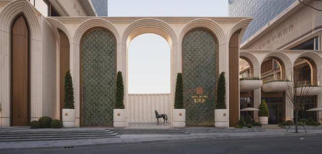 项目采用12米高拱券大门、宝格丽绿石材与古铜金属线条交织,形成迎宾序列;意大利贝金米黄石材弧形景墙与铜马雕塑传递“龙马精神”寓意。近十二米通高的拱券,通体以石材打造,层层叠涩,气势恢宏。
