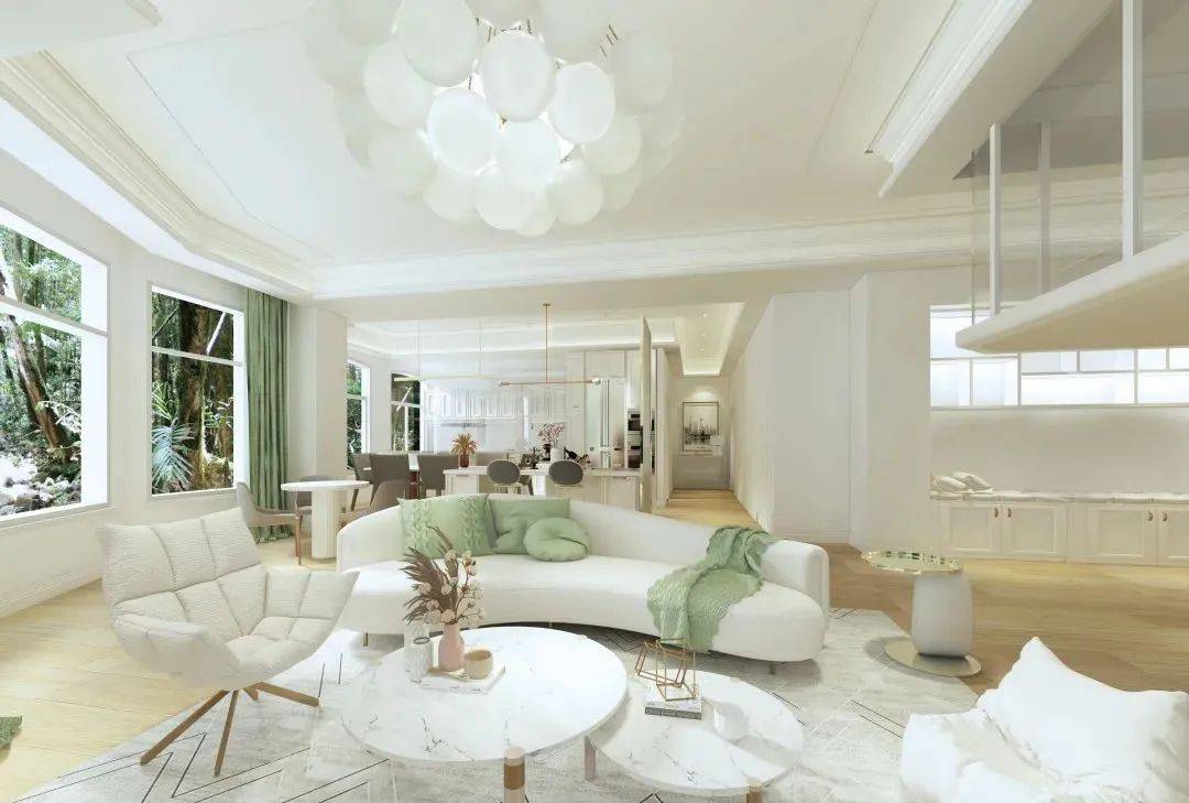 客厅:整个客厅与餐厅直面三林公园,在客厅通过落地玻璃窗可以270度观赏三林公园的四季美景,呼吸自然氧吧给我们带来新鲜空气。