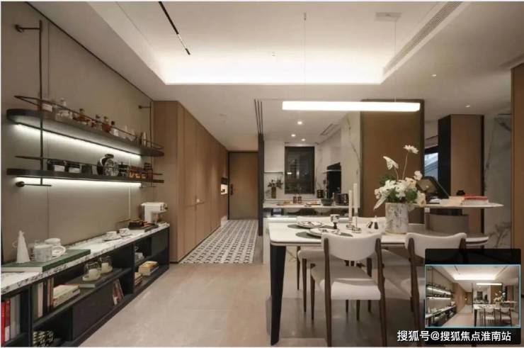 其中,餐厨系统的进阶不只在于橱柜、拉蓝等细节的收纳,更在于映江润府引入创新的S墙,可以轻松将冰箱移出厨房,同时保证视觉效果的整体性。