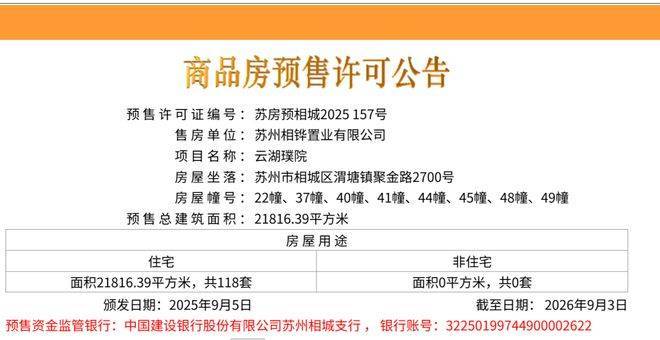 最新,位于相城的云湖璞院再次取证,共118套房源。