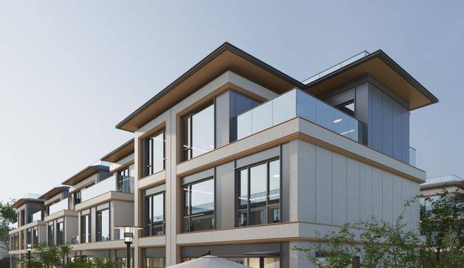 项目外立面上,以简洁大方的米白色和沉稳的暖灰色相搭配,大气稳重。同时还镶嵌香槟色金属饰面,搭配大面积玻璃,高级感满满。