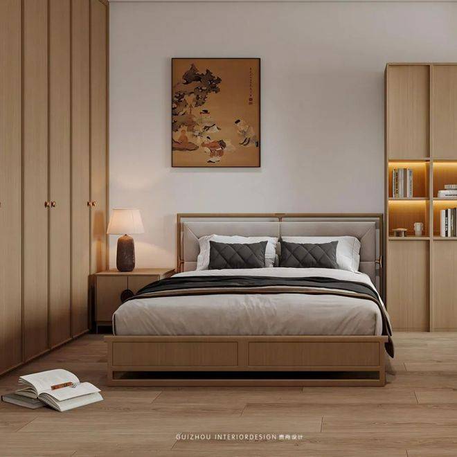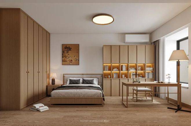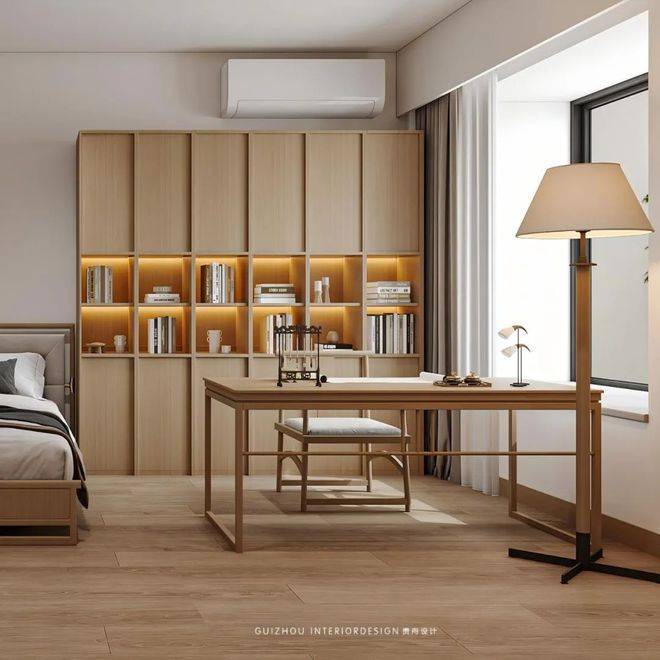 这个房间是业主爸爸居住,也是一个书房,在这里可以休息、可以看书、可以练习书法也可以办公,打破传统界限,解锁卧室的N种可能。