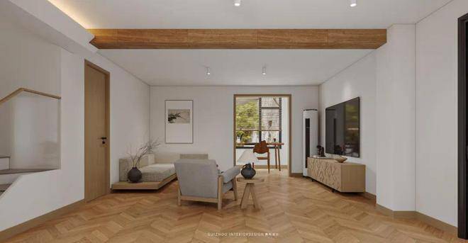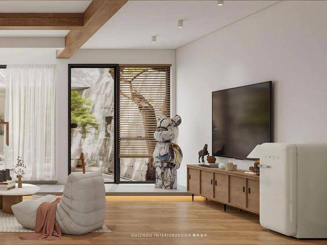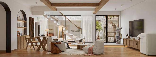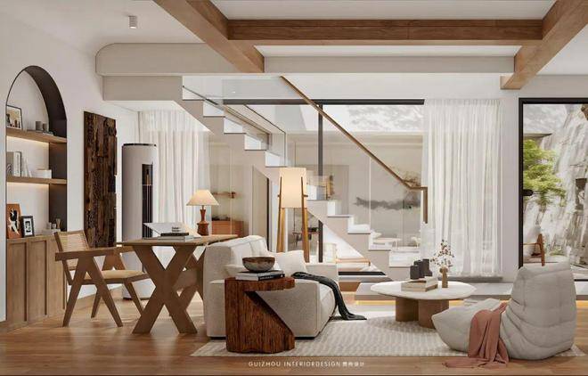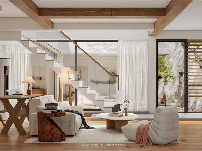 起居室素白的墙面如宣纸般铺展,深褐色的木梁在屋顶延伸视觉,整面落地窗将庭院景致引入室内。