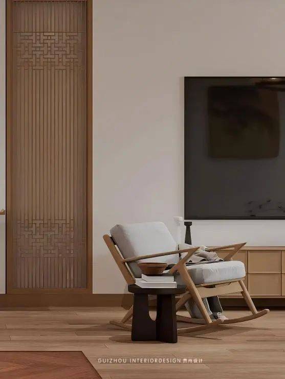 原木色单人摇椅椅搭配亚麻材质的的坐垫,符合宋氏美学中强调触感的温润与自然的肌理,不同之处又充满平衡感!