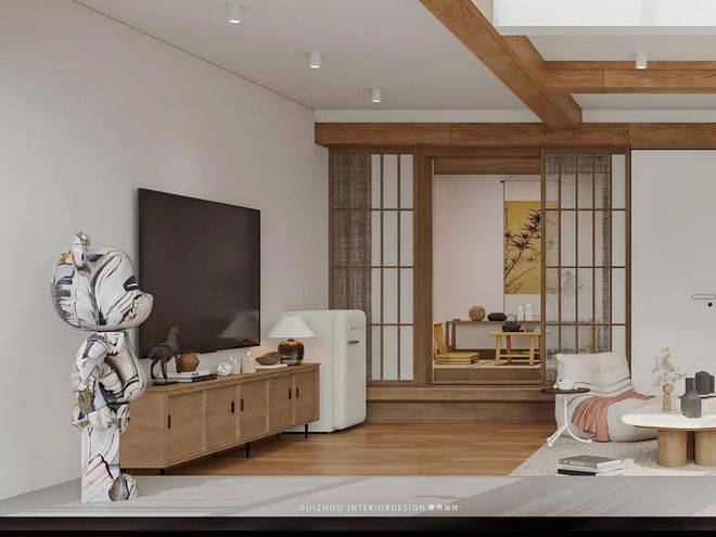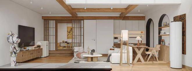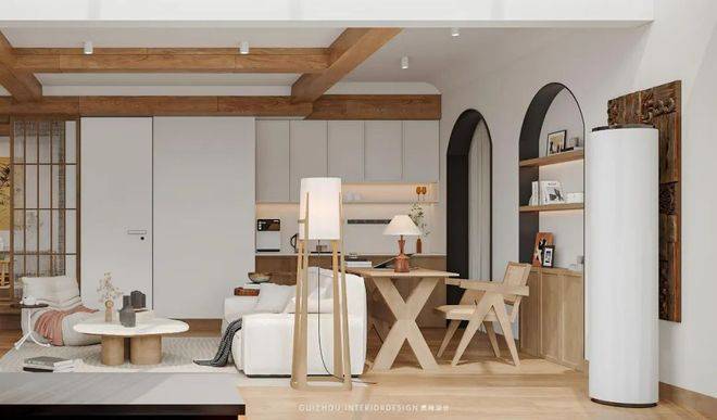 整体原木色主调搭配灰色素雅软装,是禅意与烟火气完美交融。