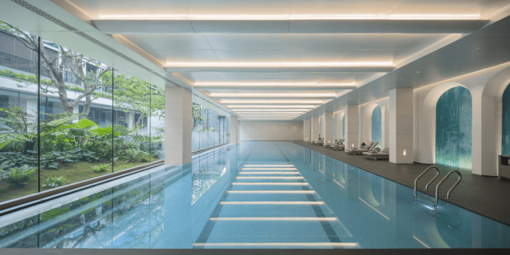 总计约1300m²的殿堂级会所。恒温泳池、健身房、影音室等生活场域,早已超越功能本身。恒温泳池旁,背景墙由于昭大师创造,深邃的艺术氛围,带来度假般的松弛体验。健身房的落地窗外即是园林景致,运动时亦能与自然艺术相拥。此刻,会所已不再是单纯的社交空间,而是艺术生活的沉浸式剧场。