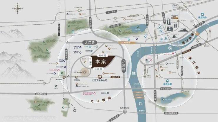 之江银泰(约500米)、西投银泰(约1.6公里)地铁6号线之江文化中心站(南门出发步行距离约600米),求是之江二小+对口初中之江第一中学(期房不承诺学区,具体学区划分以教育局公布为准),之江文化中心“四大馆”,医院:浙江大学医学院附属第一医院(之江院区)(约1.7公里)。
