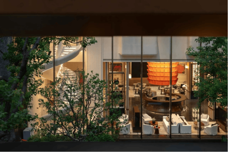 坡道墙面以进口石材、透光云石与金属线条组合,灯带延伸如“光影缓冲带”。