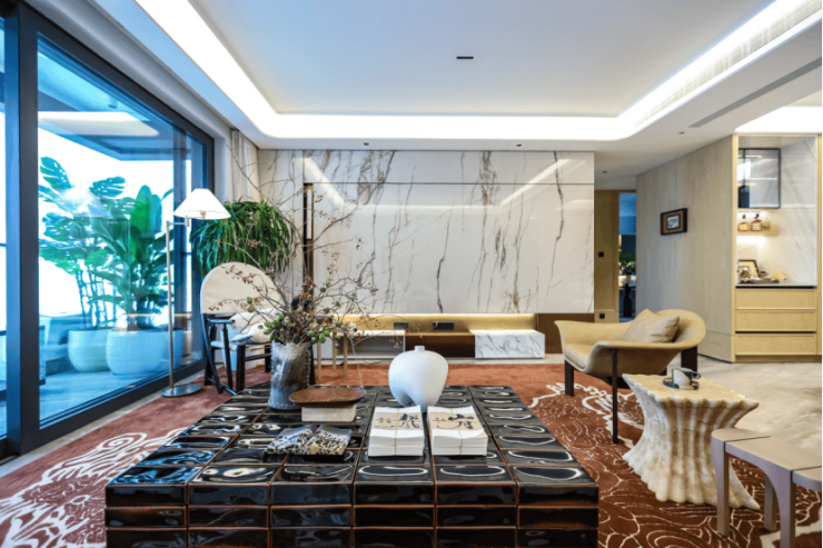 客厅选用希腊灰密拼瓷砖、四边吊顶结合悬浮反光灯槽、岩板电视墙,一眼就能感受到世家大宅的气度!