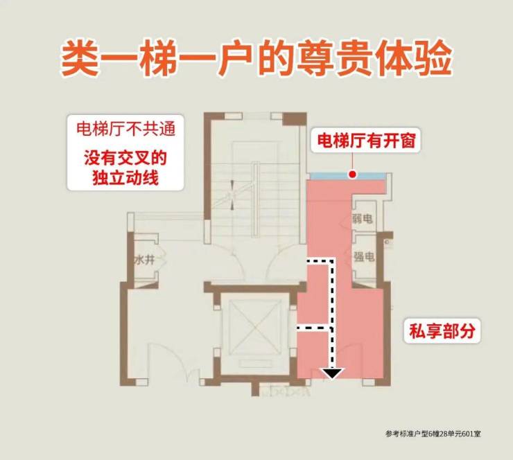 该户型采用电梯双开门的类一梯一户设计,既保障了高得房率,又实现了公区私有化效果,提供了额外的套型外储藏空间。