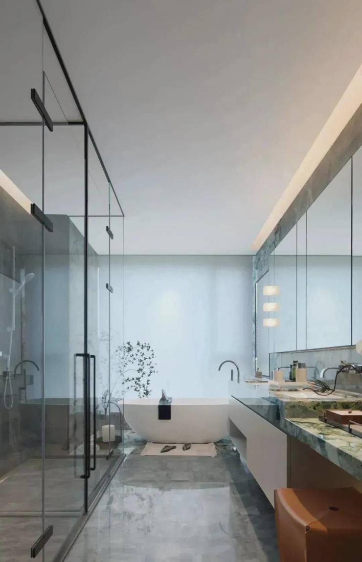 穿过一小段走廊,到主人的休憩区,先是舒怡的衣帽间,朦胧柜饰面,让休整充满优雅从容。卫生间以星雅灰大理石覆面,独立浴缸旁则用冷翡翠奢石点缀,一侧更设有整面玻璃,通透明亮。若沐浴间小酌,望见城市界面,于雅居,见繁华。