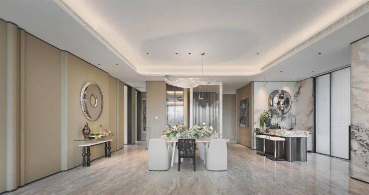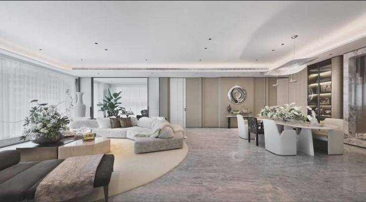 东区建面约320户型,将艺术感进一步融入日常中。特别设计的专属门厅空间,是从电梯厅延伸到家,如同一处艺廊,放慢人的情绪;室内选用了浅金色奢石(外界也称其为“芬迪白大理石”)作为主要的石材,曲面的木饰面也为浅色,整体给人以明亮感。