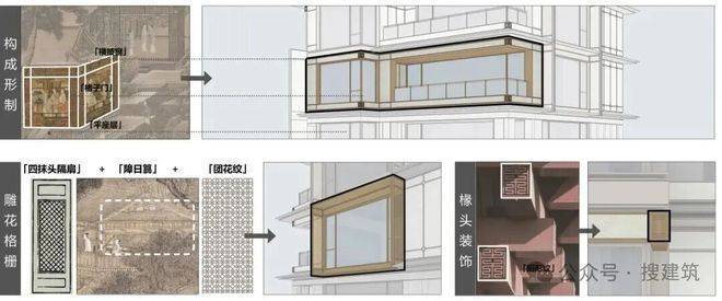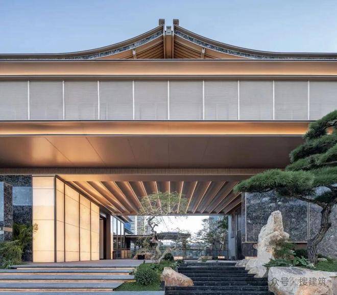 细部处理上,将东方建筑符号转化为现代建筑语言:歇山顶山花处的悬鱼构件成为空中的雅致点缀;转角嵌饰回形纹椽头,将结构之美凝练为精致符号;雕花格栅源自宋代传统门窗的四抹头隔扇,以其通透特质引光入画,赋予建筑随时间流转的光影表情。