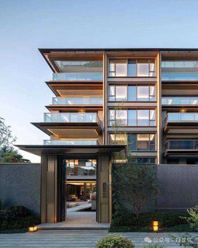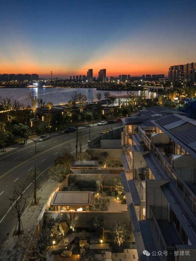 叠墅立面则采用斜边框挑檐造型与舒展的水平线条,塑造出轻盈优雅的建筑形态,与东沙湖宁静开阔的景致相呼应。