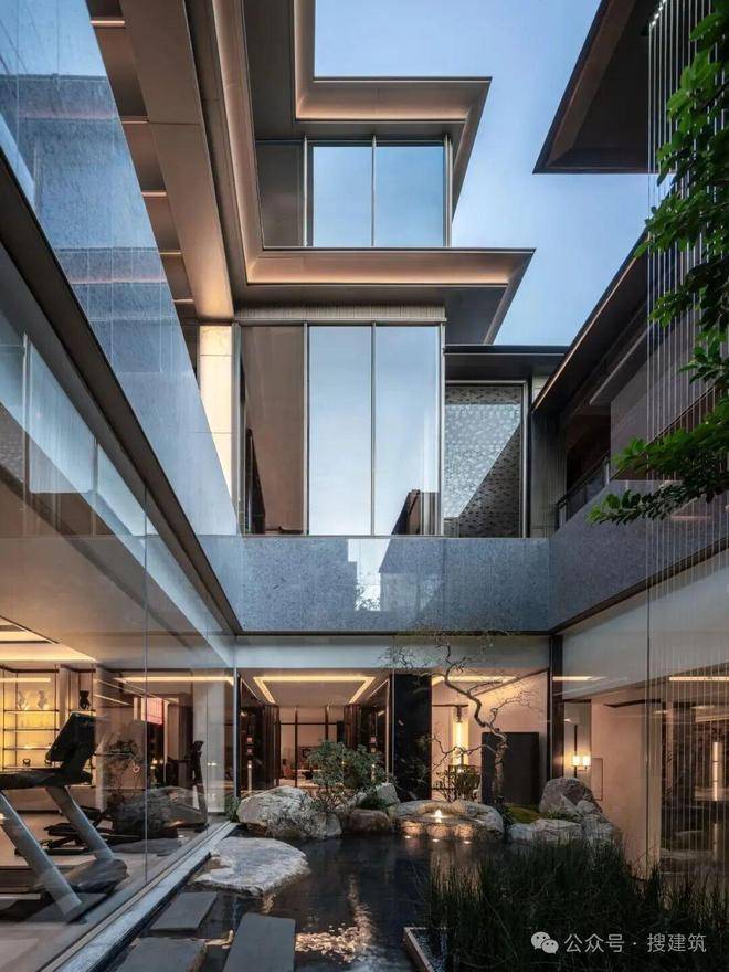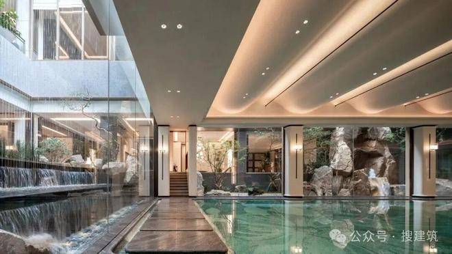 小区用地捉襟见肘,如何将公区功能合理置入紧张的用地之中是设计难点。设计巧妙地通过底层架空的方式,把主要功能空间设置于二层及地下室。底层抬升处自然形成了入口灰空间,视觉可透过水幕窥见园内景致,营造景观外溢感,释放地面空间并强化入口通透感。同时,借场地高差在坡道上部构建层级景观,与中心庭院形成视觉、流线的衔接,以 “小中见大” 手法打造丰富游览序列。