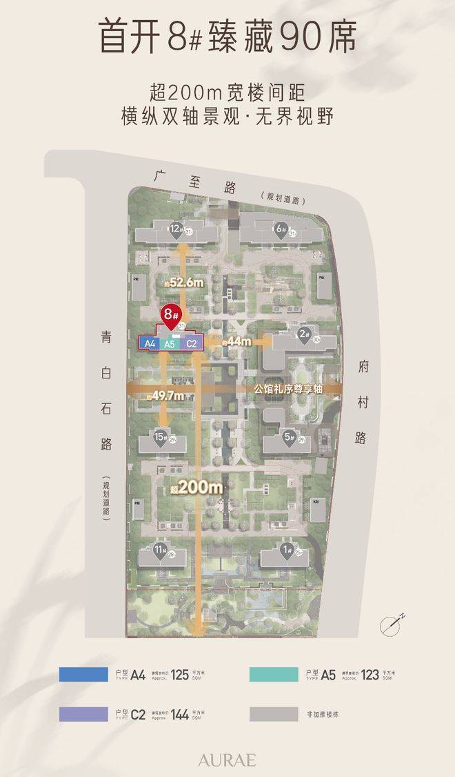 首先,8# 楼间距优势亮眼,南北向楼间距普遍达到约50米,东面楼间距也有约44米,部分144㎡户型更能拥有约200米的开阔视野,碾压新房常见的30米栋距。