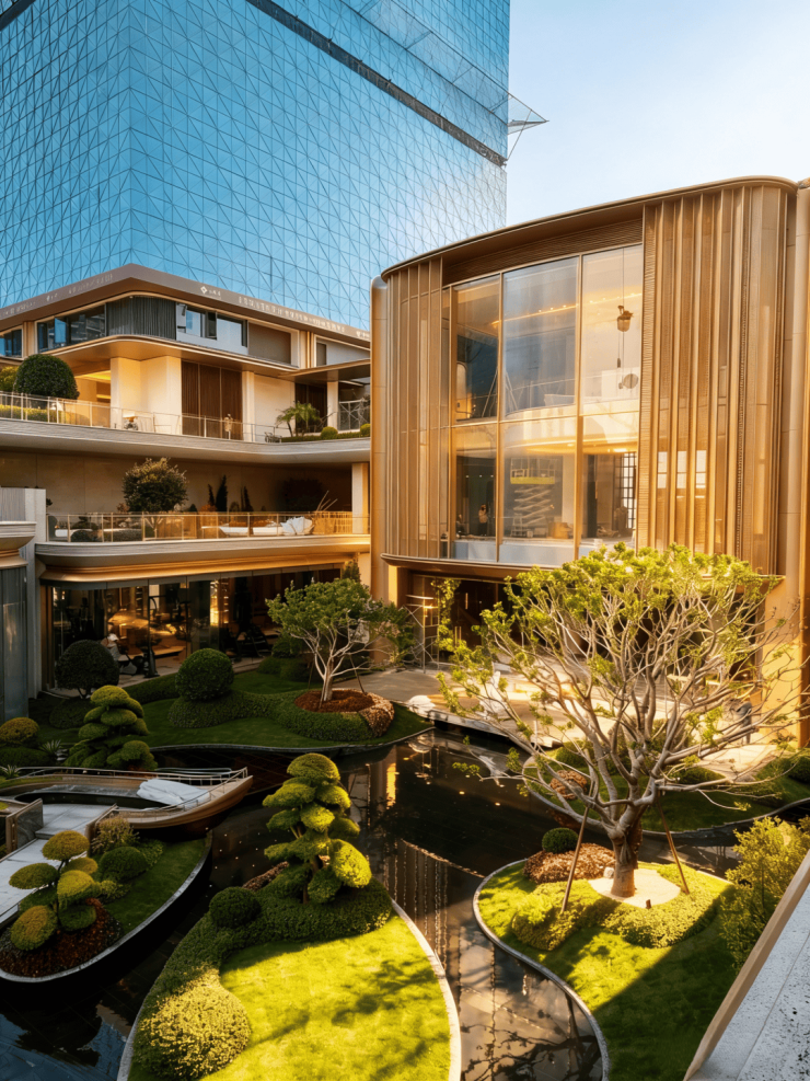 外立面采用流畅弧线转角设计,搭配Low-E中空玻璃幕墙,辅以香槟色格栅与铝板点缀,与云城地标“金钥匙”、“金手指”交相辉映,共同构筑世界级中轴线上的艺术景观。