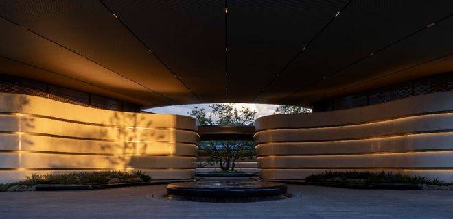 项目示范区整体延续这一设计理念,从入口大门到下沉庭院,总体布局灵感源自峡谷意象,以中央大花园为核心展开,以层层蜿蜒的大理石勾勒峡谷般的流动感。叠级曲线设计仿若水纹,营造出富有层次感与自然韵律的空间体验。