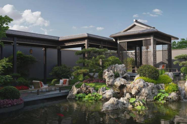 In the center of the clubhouse, a four water return hall full of Chinese charm is designed: the eaves are surrounded on all sides, and stretched pine trees are planted in the middle, carrying the Confucian concept of "unity of heaven and man" in traditional Chinese culture. During the rainy season, water gathers from the eaves on all sides, symbolizing wealth and feng shui, as well as the beautiful wish for family reunion.