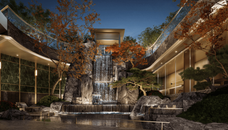 社区入口的施华洛世奇“金韵云光”雕塑,是“九相园林”的开篇仪仗 ——8.2万颗水晶与4.3万片金箔手工缀合,日光下碎光流转。循光入园,动线随景致自然延伸:600吨中国黑原石叠筑的7米飞瀑水声渐起,200万级300年黑松自成景致,搭配鸡爪槭、乌桕等名贵绿植,光影、水声与松影交织,让每一步游园都藏着层次与意趣。
