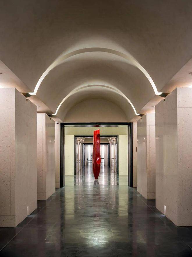 二楼的接待大厅,一尊拔地而起的红色雕塑,其顶部向上挑空到了三层。整个厅堂,都将不定期的进行展品更新,艺术气息浓郁。