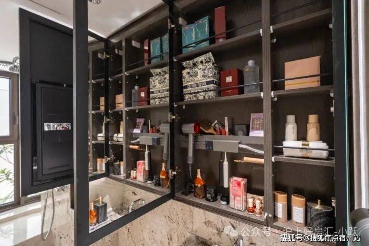 眼前一亮的是卫生间收纳,项目的镜柜是内外双镜,并且内部的收纳空间相当丰富,小到女主人的发箍、面膜、口红、香水,大到吹风机都有适合的位置。