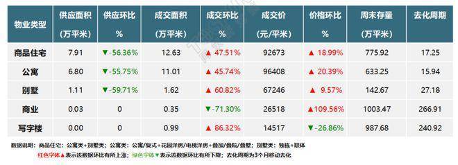 本周商品住宅新增供应7.91万平米,环比下跌56.36%,成交量12.63平米,环比上涨47.51%,成交均价92673元/平米,环比上涨18.99%。商业新增供应量0.03万平米,成交量0.35万平米,环比下跌71.30%,成交均价26518元/平米,环比上涨109.56%。办公无新增供应量,成交量0.99万平米,环比上涨86.32%,成交均价14517元/平米,环比下跌26.86%。存量方面,本周商品住宅存量775.92万平米,去化周期降至17.25个月。