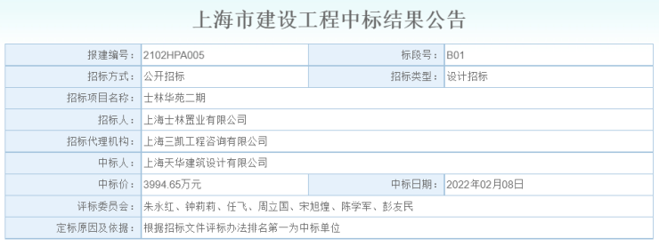 2022年2月8日,上海天华建筑设计有限公司以3994.65万元中标士林华苑二期地块设计项目