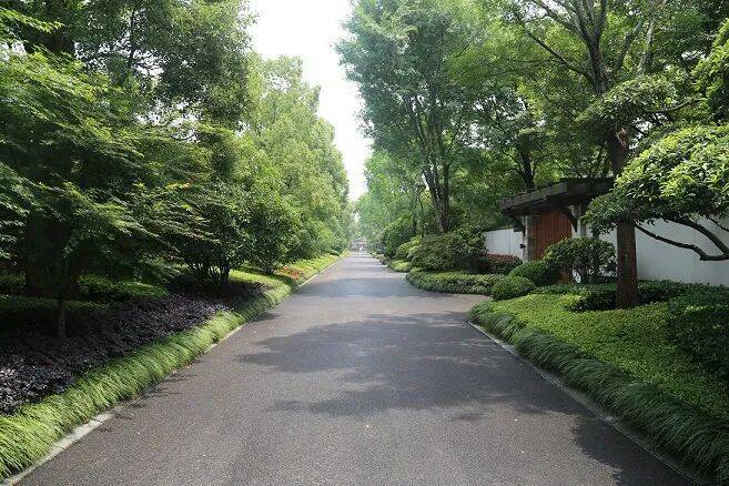 道路两旁的绿化带分高中低三个层次种植常绿植物、落叶植物、球类植物和色块灌木,营造幽静深远的生活意境。