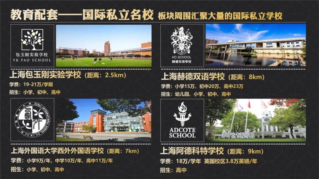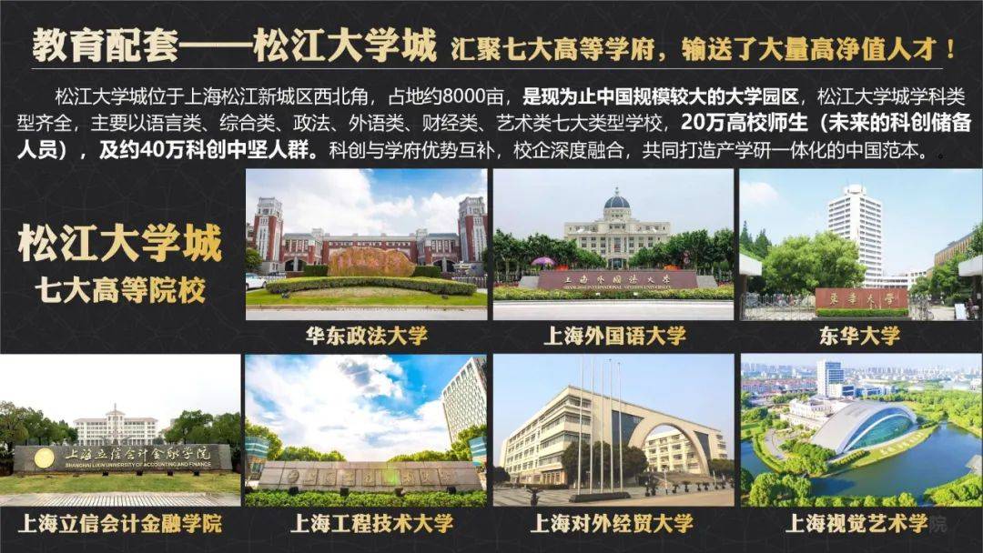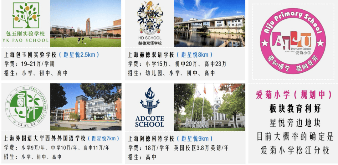 教育资源方面:包玉刚实验学校、上海赫德双语学校、上海西外外国语学校、阿德科特学校、爱菊小学(园区规划)、全国较大的松江大学城等;
