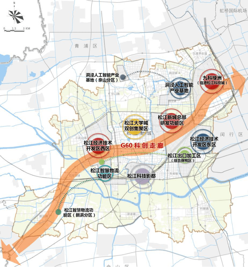 在上海科创版图中,松江G60科创走廊占据龙头位置,在G60高速两侧形成“一廊九区”的布局,集聚40多家世界500强,聚集了松江约90%的工业产值占上海工业产值近10%。