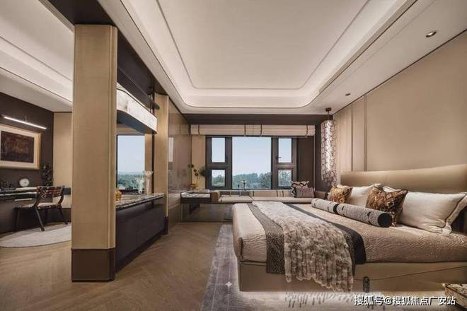 动静分区,设计了巨幕横厅,将景观和视野极致化表达。整体奢阔三房两卫设计,包含豪华主卧行政套房和老人房。