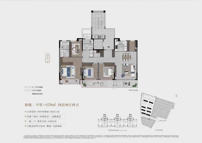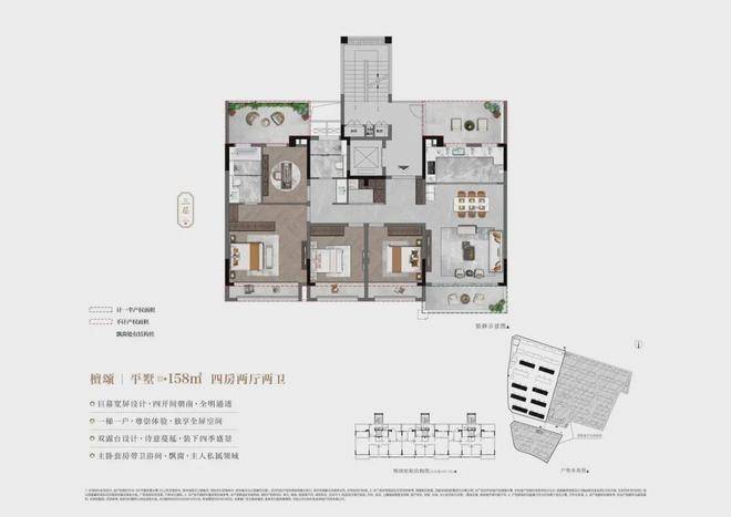 建面143-158㎡平墅单元融合大平层与别墅产品优势,北向露台进深优化至2.45米,配置L型观景露台系统。创新性增设侧向延展露台,配合18.9米全景宽厅设计,打造270度景观界面,实现超越传统大平层的别墅级居住体验。